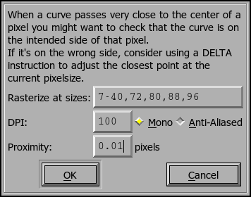 The dialog opposite will check the glyph at pointsizes 7-40, 72, 80, ... where the screen resolution is 100 for places where a spline comes within .01 (in pixel units) of the center of a pixel.
