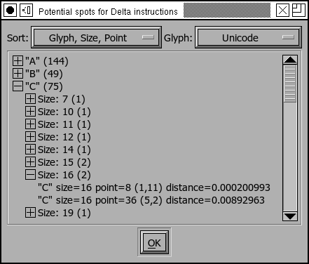 It is possible to reorder the list... depending on what is most important. At right data are organized by glyph, size and point. It might also be useful to see which points in a glyph are close to problems.