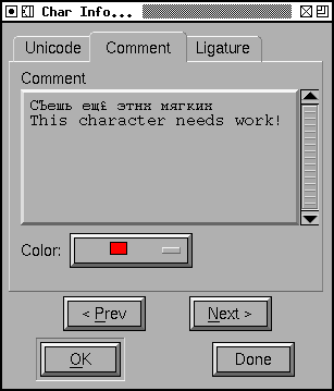 The Next and Prev buttons allow you to move from one glyph to the next (if, for example, you need to enter encodings for a range of glyphs).