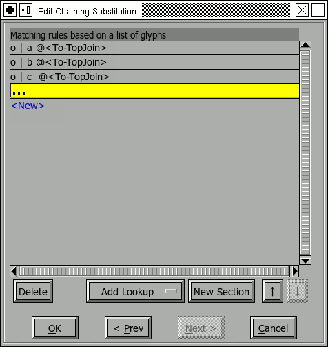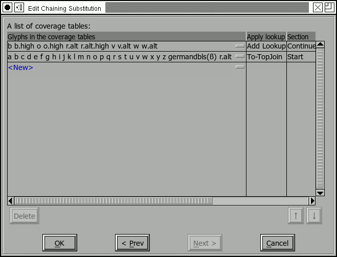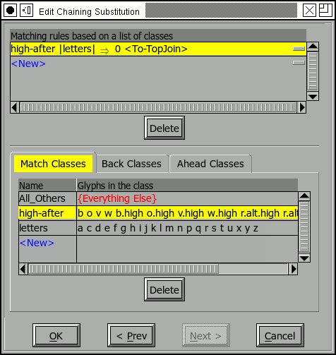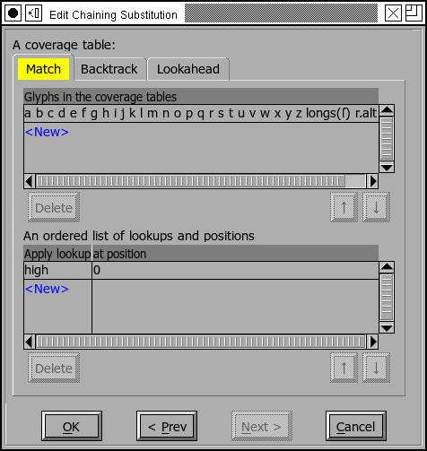 In the example at right, the lookup 'high' will be applied to any glyph that matches the coverage table at the top of the list. Again the buttons under the sequence lookup list allow you to add, change, remove or reorder these transformations. (And yes, the order the transformations are applied can matter in complex situations).
