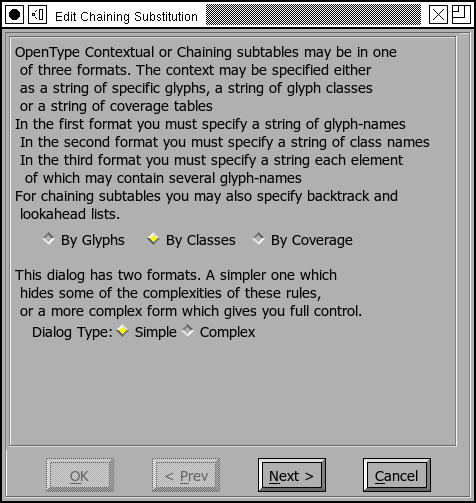 Most contextual specifications are fairly simple, FontForge has two dialog formats, one for simpler specifications and one for more complicated ones. The complicated dialog is (I think) more difficult to understand, but allows for greater generality.