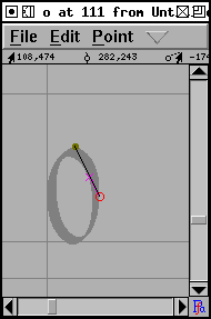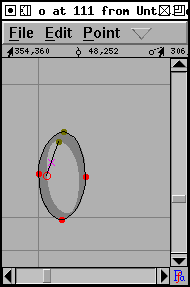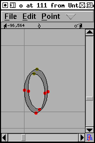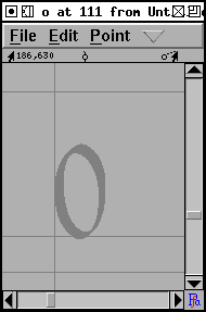 Zu beachten ist, daß der erste Umriss im Uhrzeigersinn und der zweite gegen den Uhrzeigersinn gezeichnet wurde. Dieser Wechsel in der Zeichenrichtung ist wichtig. Sowohl PostScript also auch TrueType erfordern, daß die äussere Begrenzung eines Zeichens in einer bestimmten Richtung gezeichnet wird (diese sind für diese beiden Standards genau in der jeweils entgegengesetzten Richtung). Innerhalb von FontForge müssen alle äusseren Begrenzungen im Uhrzeigersinn gezeichnet werden, während die inneren Begrenzungen gegen den Uhrzeigersinn gezeichnet werden müssen.