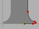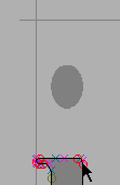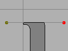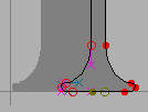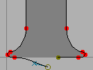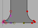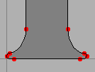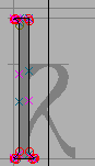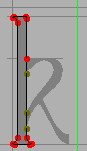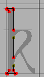 | Der gespiegelte Serif wird nach links gezogen bis er auf der linken Kante der Vorlage liegt. | Der Pfad wird deselektiert, einer der unteren Endpunkte eines Serifen ausgewählt und auf den gegenüberliegenden Endpunkt des anderen Serifen bewegt. | Der Rest der Zeichens wird nun gezeichnet. | |