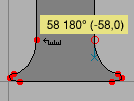| Zum Schluss werden noch zwei Schritte durchgeführt: die Messung der Stammbreite und die Markierung der Höhe des "l". | Aus der Werkzeugleiste wird des Linealwerkzeug ausgewählt und mit der Maus von einer Kante des Stamms zur anderen gezogen. Aus diese Aktion hin erscheint ein kleines Fenster, dass in diesem Beispiel eine Breite von 58 Einheiten anzeigt, die Richtung beträgt 180°, es wurde -58 Einheiten horizontal und 0 Einheiten vertikal gezogen. | In der Layerpalette wird nun die "Führung" Option ausgewählt (welche den Führungs-Layer editierbar macht). Dann wird an der Oberseite des "l" eine Linie gezogen, welche danach in allen Zeichen des Schriftsatzes sichtbar ist und dessen Anstieg markiert. | |