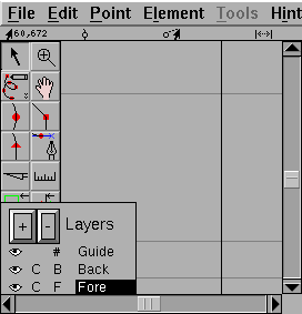 The outline glyph window contains two palettes snuggled up on the left side of the window. The top palette contains a set of editing tools, and the bottom palette is for managing drawing layers. They can be added, deleted (not all!), shown or hidden, for example.