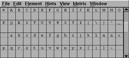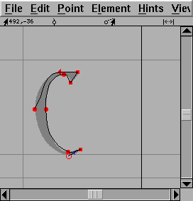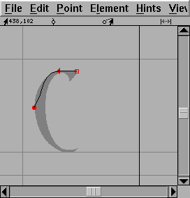 This window also shows the glyph's internal coordinate system with the x and y axes drawn in light grey. A line representing the glyph's advance width is drawn in black at the right edge of the window. FontForge assigns an advance width of one em (in PostScript that will usually be 1000 units) to the advance width of a new glyph.
