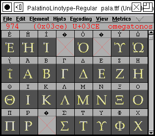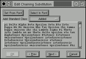 ![]() Now you could go back to the font view and select all of the greek letters, and then press the [Set From Font] button in the class dialog. |