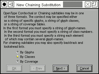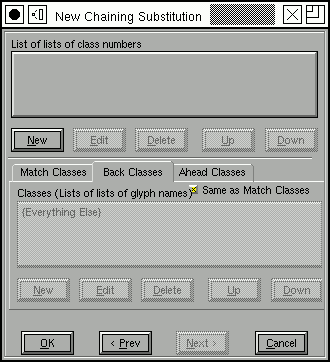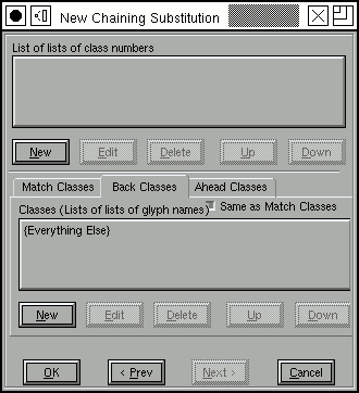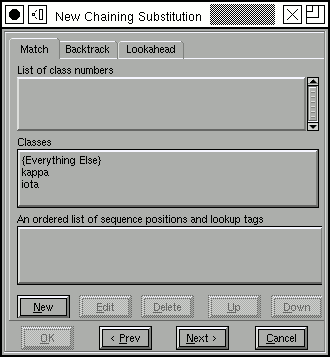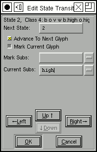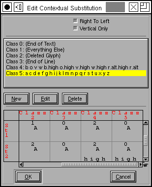 Each category of glyphs may divide glyphs into a different set of classes, but in this example we use the same classes for all categories (this makes it easier to convert the substitution to Apple's format). The first line (in the ``Matching rules'' field) should be read thus: If a backtracking glyph (the glyph before the current one) in class "high-after" is followed by the current glyph in class "letter", then that letter in the match string (that is the current glyph) should have simple substitution `To-TopJoin' applied to it.