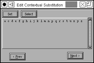 The tricky part is defining the context. This is done by defining yet another lookup, a contextual chaining lookup which should be associated with a 'calt' feature. And of course we want an associated subtable). This will pop up a series of dialogs to edit a contextual subtable