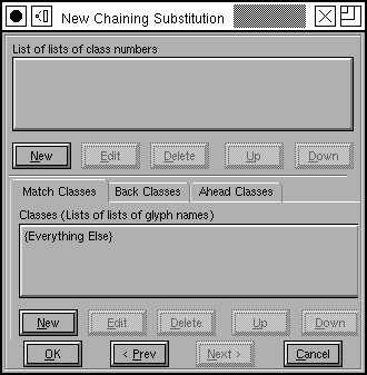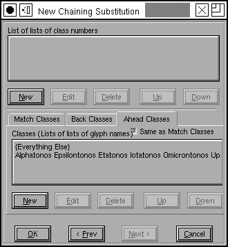 You may edit a pattern in the obvious way. As you enter glyph names they will be auto completed for you. There are two buttons down at the bottom of the pattern list, one to start a new section (go from back tracking to active, or from active to lookahead), and one to add a new lookup reference.