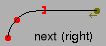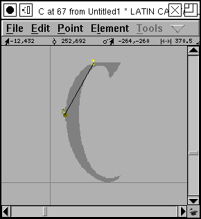Generally a corner point should have a constraint (or another corner) point on either side of it, so we need to pick another constraint. In this case the contour will change from a straight line to a curve, so that means a "prev constraint" point. |