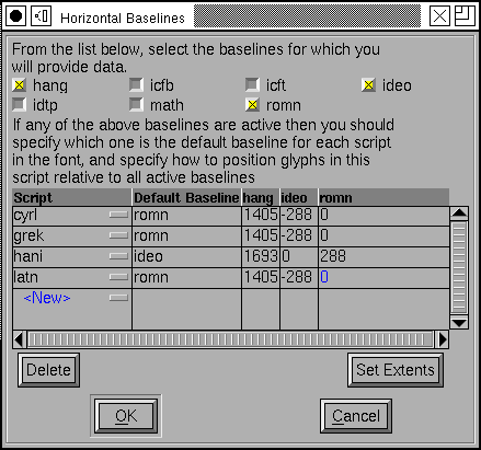 You need to select which baselines your font will support. You may want to specify baselines that apply to scripts which aren’t in your font – this will mean your font is positioned reasonable when used with glyphs from other fonts. In the example above, the font has no Indic characters, but it still specifies a hanging baseline.