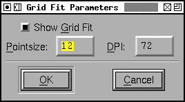 The Show Grid Fit command will ask you for some basic information first. It needs to know the pointsize and resolution for which you want the action performed (the example at right is 12pt on a 72dpi screen).
