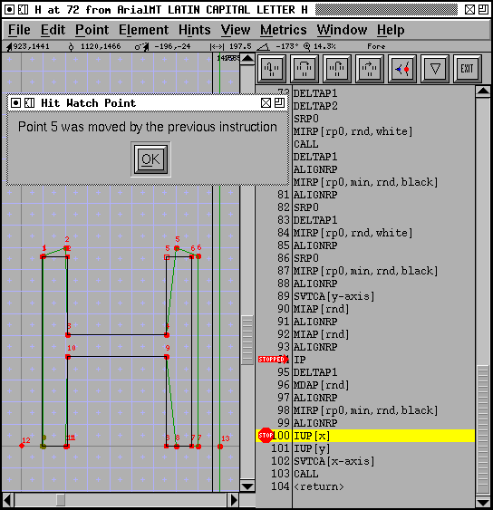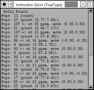 At the top of the window, underneath the menu bar is an information line. The first item is the location of the mouse pointer (in the internal coordinate system of the glyph). If there is a single selected point then the next item gives its location, and the next three are, respectively, the offsets from the selected point to the current location, the distance from the selected point, and the angle from the horizontal (measured counter-clockwise). Then we have the current scale factor, and the layer which is active. Finally (in the debugging view) is an indication of whether the instruction pointer is in the glyph program, the ‘prep’ program of the ‘fpgm’.