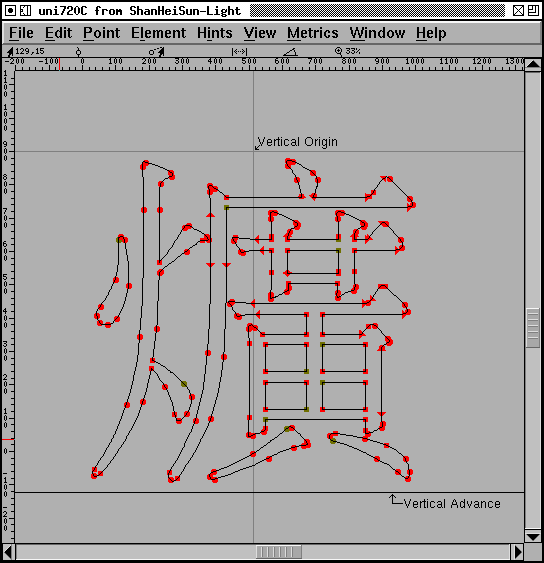 In addition to showing you all the points in your glyph there are either 2 or 4 additional points. These are the so-called “phantom” points and represent the horizontal and vertical metrics of the glyph (old versions of freetype will only display 2 points – left side bearing and advance width, while newer versions will display top side bearing and advance height as well).