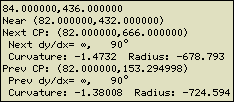 If you depress the button and drag, the first line of the tool’s pop-up shows the distance, angle and (x-y) offsets from the first point where you depressed the mouse to the last point, the mouse’s current location. The next lines in the pop-up show information about points along the line that intersect splines, including the start and end points of the line itself. If there are more than two intersections then the x, y, and total distance between the first and last intersections are shown before the point list.