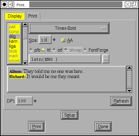 This dialog allows you to display text in any fonts you have loaded into FontForge and see how they look on the screen and together. Having done that to your satisfaction you may optionally print the result.