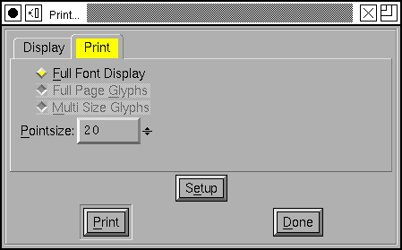 There are other printing options too. At the top of the dialog are a set of tabs “Display” and “Print”. The “Print” pane allows you to print certain standard displays of a single font.