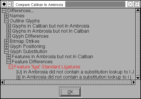 You can also use it to compare truetype and postscript versions of the same font. Normally fontforge checks to make sure all the splines match exactly, but you can also have it test whether a contour in one font is always close to the similar contour in another font, or whether a contour in one font is inside a reference in another (these are common when comparing PostScript fonts where the format loses references).