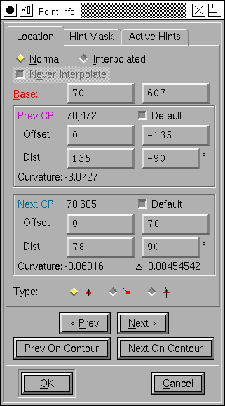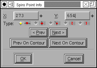 You may also change whether a point is a curve, corner or tangent point (Caution: Changing from a corner point to a curve point and back to a corner point is NOT a no op. It may change the control points) You may move on to the next or previous point on the path, or the next/previous point of the current contour. If you cancel then all changes to all points are canceled.