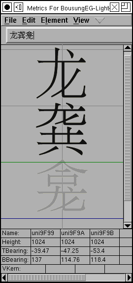 One of the glyphs is active. That glyph has a green line on its left (at its origin) and a blue line on its right (its width). You may change the width by dragging this line. You may change the left side bearing (lbearing) of the glyph by clicking on the glyph and dragging it left or right. You may change the kerning between this glyph and the one to its left by dragging the green line around. (If you wish to create a Device Table for small pixel sizes you must use the Kern Pair Closeup dialog)