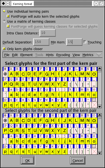 But the more interesting stuff follows this. A kerning by class actually consists of two sets of classes – one set for the first glyph of the pair and one for the second glyph of the pair. A glyph class consists of a space separated list of glyph names (For most glyphs you may also enter the unicode character itself, and fontforge will convert that to a glyph name).