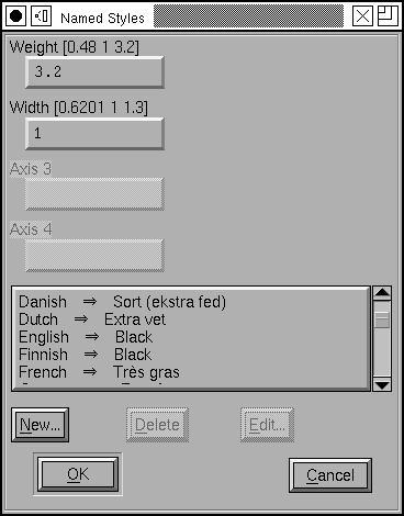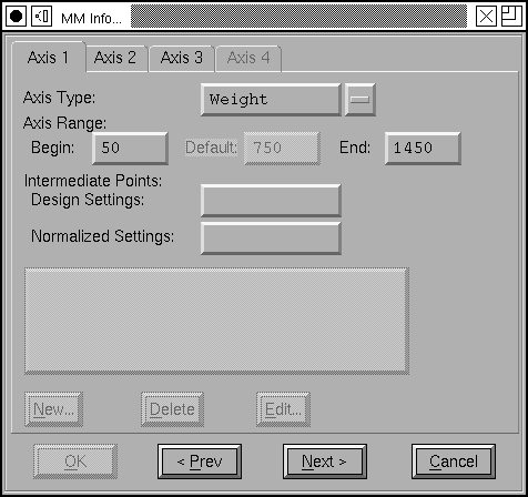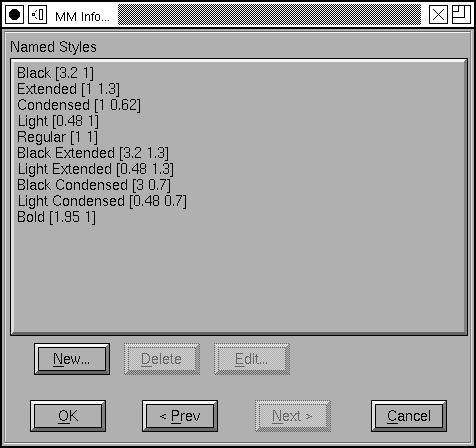 This dialog is used for creating and modifying multiple master fonts. It contains several sub-dialogs which must be processed in sequence, and follows pretty closely to the process described above. I will first show the sequence for Adobe’s fonts, and then explain Apple’s fonts.