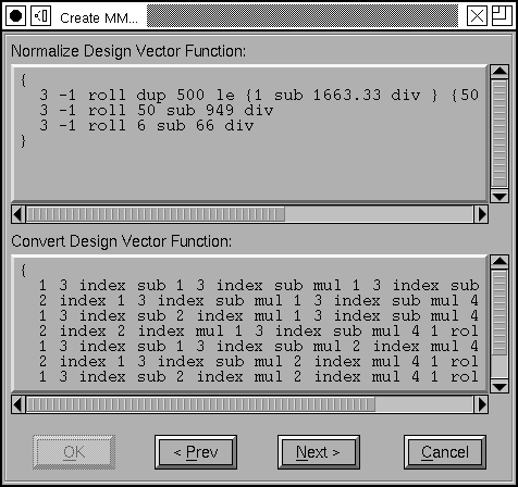 This screen shows the postscript functions needed to map a design vector to a weight vector (ie. given positions on each of the design axes, these produce blending coefficients for each master design). In most useful case FontForge is able to generate these functions automatically, but if you use intermediate designs things get too complicated for FontForge and you must enter the functions manually.