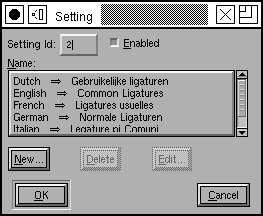 To add a new setting press the [New] button under the setting list. The setting dialog contains the numeric value of this setting (Apple has decreed that if the feature is not mutually exclusive, all settings must be even numbers), whether this setting is on by default, and then a list of names for the setting in as many languages as you like.