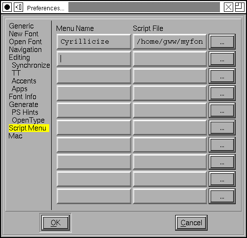 This section of the dialog allows you to define built in scripts that will show up in the script menu. Each entry has two things associated with it, the menu name and a script file. The menu name will be the name of this entry inside the script menu, and the script file will be the filename of the file to be invoked. The “…” button allows you to browse for script files, which I think have extension .pe (but which can have whatever extension you prefer if you don’t like my conventions).
