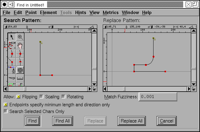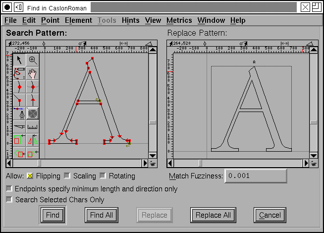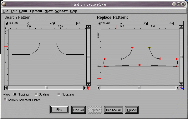 The search and replace panes behave very much like the outline glyph views and you may draw within them using the tools available in the outline view. The menu at the top of the window is a subset of the menu in the outline glyph view. Only one of the two panes is active at a given time, and the menu works on the active one. You can make a pane active by clicking in it, or by using the [Tab] key.