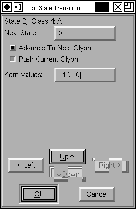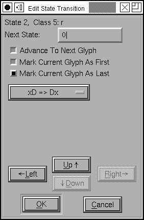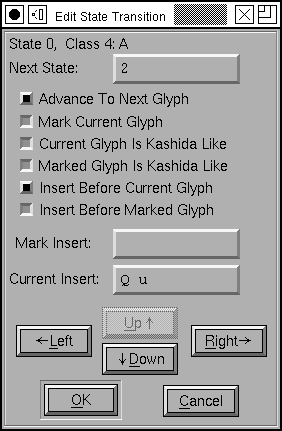 - For insertion transitions the lines specify the glyphs that are to be inserted. The first line applies to the marked glyph, the second line to current glyph (there may not be room enough to show all the inserted glyphs, in which case the glyph list is truncated). There are additional flags here that are also not shown because of lack of room. They may be viewed by clicking on a transition.