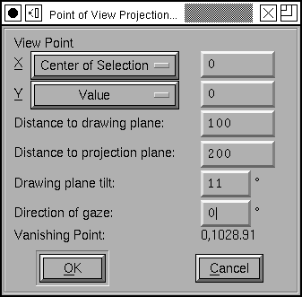 The Point Of View dialog gives you a little more freedom than is described above. It allows you to set the location of the eye (instead of fixing it at the origin), and allows you to change in what direction the vanishing point will lie (instead of fixing it on the y axis).