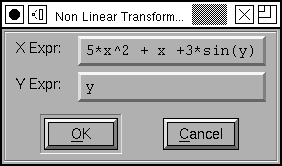 Non-linear transformations are defined by providing two expressions, one of which results in the transformed value for the X coordinate, the other provides the y coordinate. In the example at right: