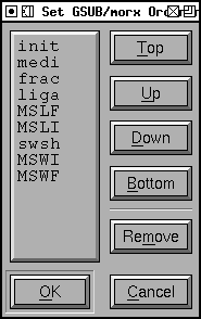 The order in which the lookups appear in this dialog is the order in which they will be applied. The order of the subtables within each lookup is the order in which they will be applied. There are buttons to the side which will reorder things.