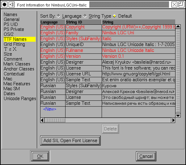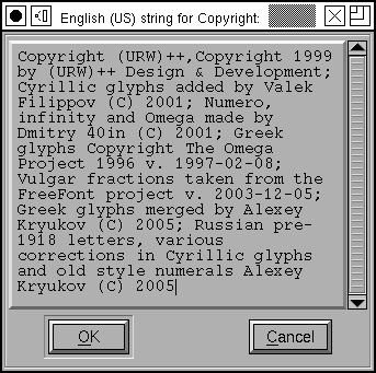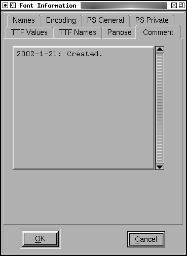 This has the same interface as the Comment above. The FONTLOG is an idea stolen from the Open Font License. It is description of the font and a log of changes made to it over time and includes some more information about the font as well (see the OFL FAQ). This pane allows you to store this information within the font itself where it won't get lost.