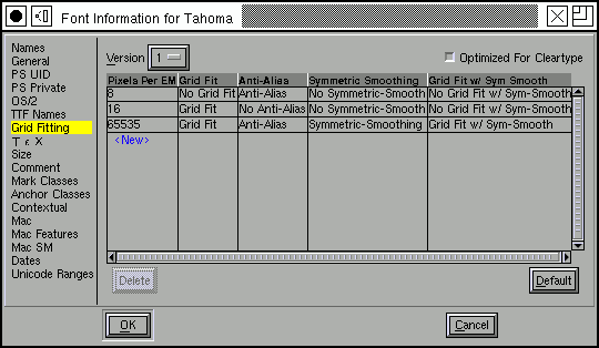 Pressing the [Default] button will provide you with a default 'gasp' table. If your font contains no instructions this will be different than the 'gasp' table for a font with instructions.