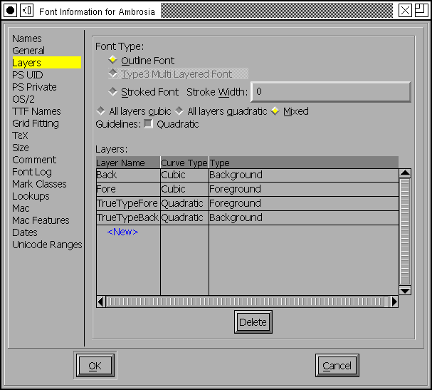 You may also decide what kind of splines you want in the font in general, often all the layers will use the same type of splines (so there are radio buttons to make that easy), but it isn't required each layer may be in its own format.