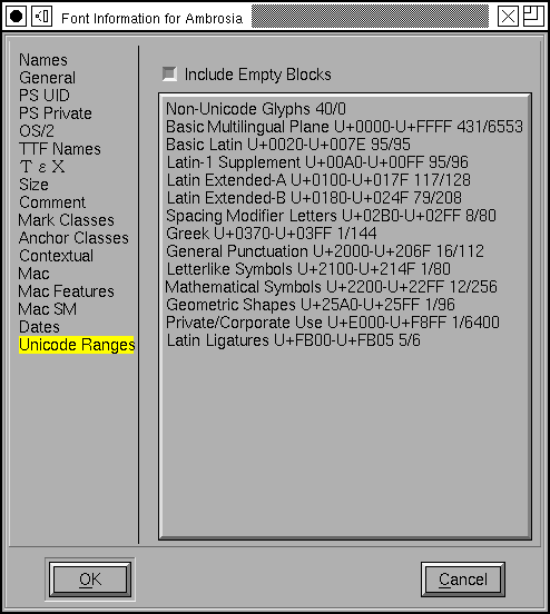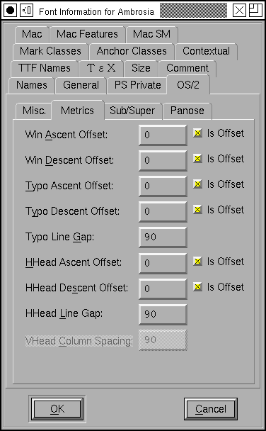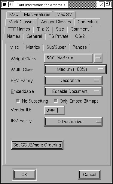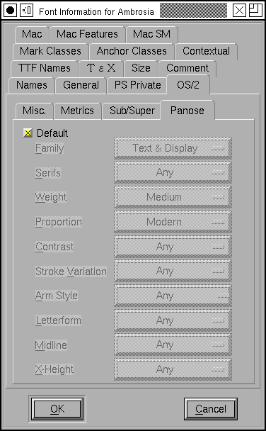 The Font Info dialog is available from all views. It allows you to name your font and various other useful bits of information. In a CID keyed font, things are more complex. Each CID keyed font is composed of man sub-fonts; this command works on the current sub-font while there is a separate command to access the information for the font as a whole -- that dialog looks the same. The dialog is composed of many different sub dialogs.