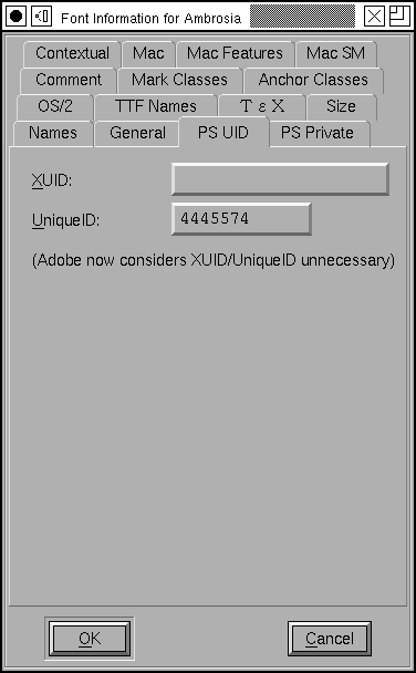 The XUID field is a collection of numbers separated by spaces and enclosed in brackets. This allows you to specify the extended unique ID of the font. If you have set the XUID preference entry then FontForge will assign values to all new fonts (by appending a number unique to this font to the end of your preference item). Adobe recommends that the XUID be changed every time the font is changed, so each time you generate a postscript font, that font's XUID (if present) will be incremented by 1 (This incrementing does not happen in CID-keyed fonts, where the XUID behavior is too complex for this simple trick). (The XUID field is only meaningful in PostScript fonts).
