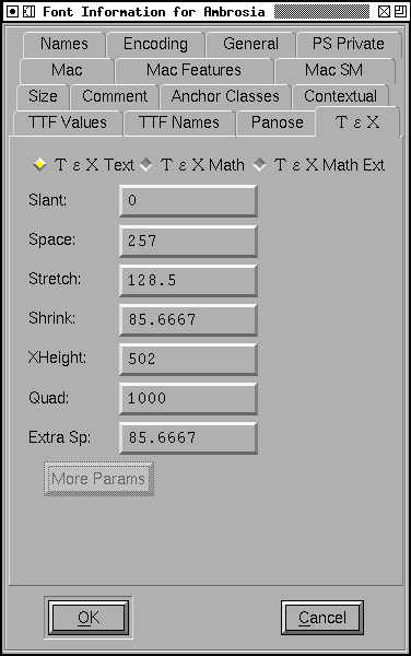 This allows you to set the TeX font parameters (which are described in Appendix F, pp 98-100 of the MetaFont Book). There seem to be 3 different types of font parameters, those for text fonts, those for math fonts and those for math extension fonts. The later two have additional parameters which are accessible through the [More Params] button. The default values for the Math parameters are probably reasonable. The default values for the Math Extension parameters are probably unreasonable.