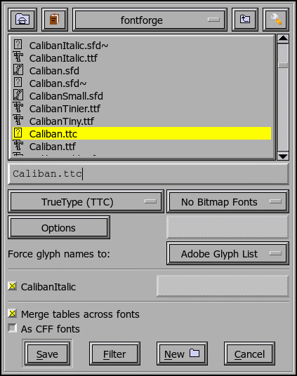 Right above the [Save] button is a list of all fonts that FontForge thinks