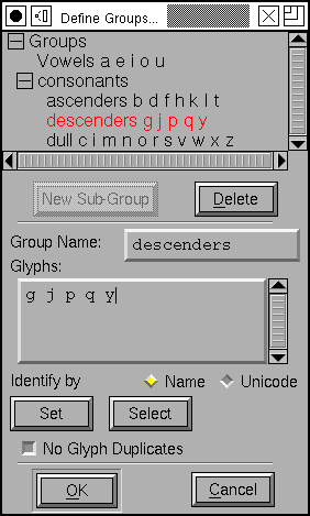 The Display by Groups dialog is shown in the screen shot at right. The top-level group is called "Groups" it has two children, one called "Vowels" which is a terminal group and contains the glyph names of the latin vowels, the other called "consonants" which itself contains three subgroups.