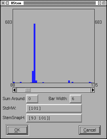The histogram dialog is used to display three things which are useful for setting the some of the global hinting values that live in the PostScript Private dictionary. The dialog can display