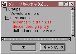 グループの名前をクリックするとそのグループが選択されます (再度クリックすると選択解除されます)。ここではグループ "ascenders" と "descenders" が選択されています。もし [OK] を押すと、選択中のグループに含まれるグリフ "b d f h k l t g j p q y" がこの順番でフォントビュー内に一覧表示されます。