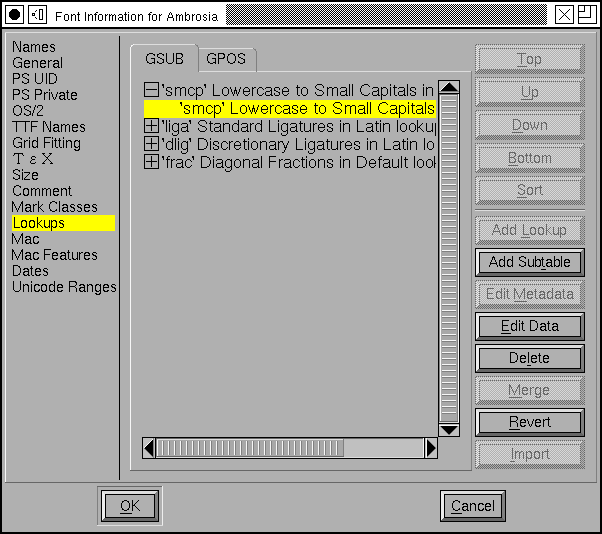 The order in which the lookups and subtables appear in this dialog is important. This is the same order in which they will be applied. All lookups in the GSUB table will be applied before any lookups in the GPOS table.