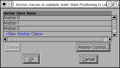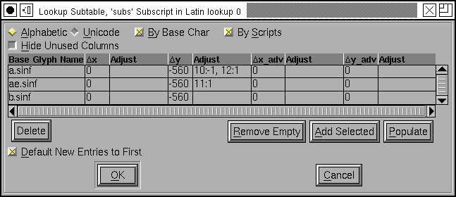 After you have created a lookup you may add subtables to it. In most cases you will only need to create one subtable, but for contextual or kerning lookups you may need two or more (the second would contain a set of kerning classes, while the first would contain any special cases).