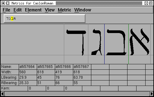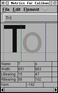 One of the glyphs is active. That glyph has a green line on its left (at its origin) and a blue line on its right (its width). You may change the width by dragging this line. You may change the left side bearing (lbearing) of the glyph by clicking on the glyph and dragging it left or right. You may change the kerning between this glyph and the one to its left by dragging the green line around. (If you wish to create a Device Table for small pixel sizes you must use the Kern Pair Closeup dialog)