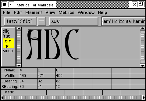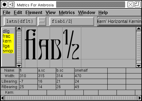Underneath the menu bar is a series of fields. The first shows the current script and language combination being used to determine what lookups to apply within the selected features, the next is a text field which allows you to enter additional unicode characters to be displayed, and finally there is a pulldown list of lookup subtables, this will be used if you create a kerning pair (the kerning pair will become part of that subtable). Underneath that is a list showing all features defined in the font. You may select which ones you want to be active in this display. (Note the features are listed in alphabetic order -- this is not the order in which the lookups will be executed (or not usually the order)).