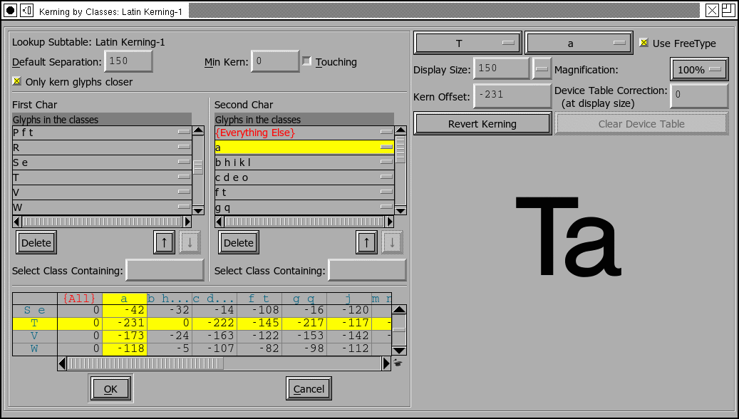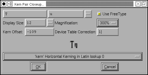 Device Tables may also be created in a number of other cases. The example above was for a kerning class. Kerning pairs may also have tables attached to them with the Metrics->Kern Pair Closeup dialog, which looks similar to the Kerning Class dialog above.